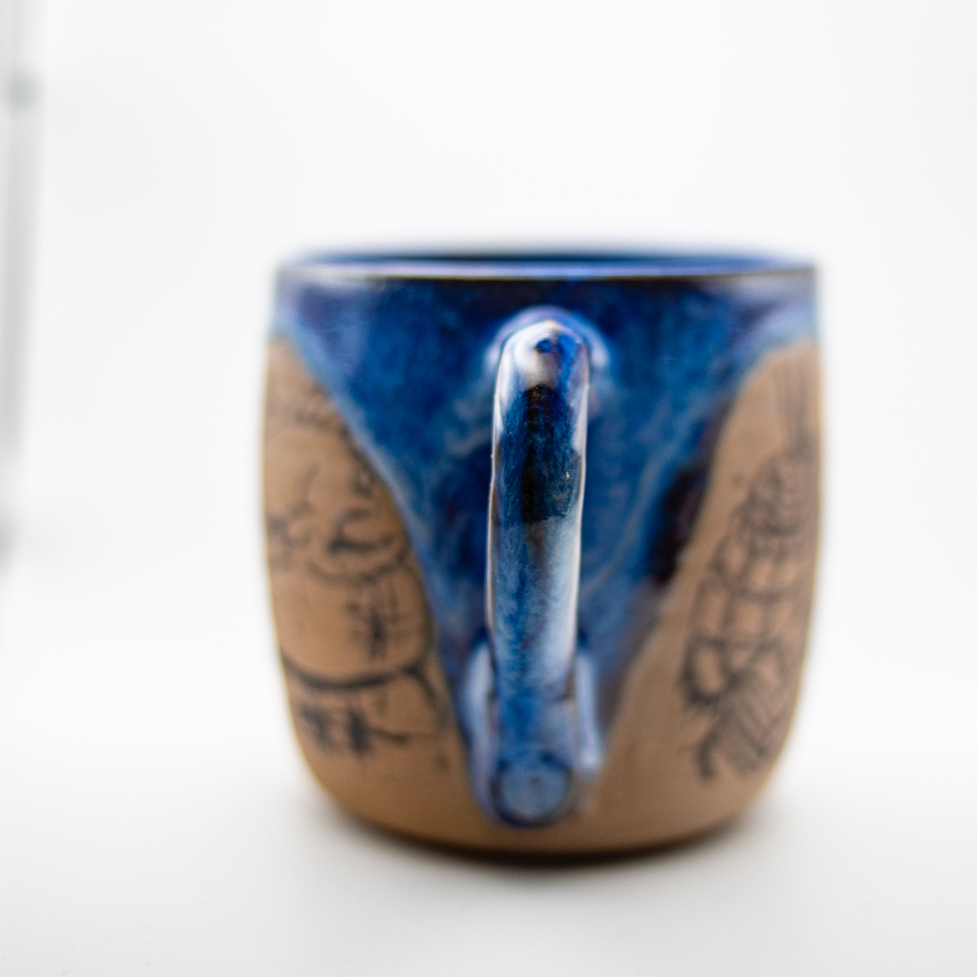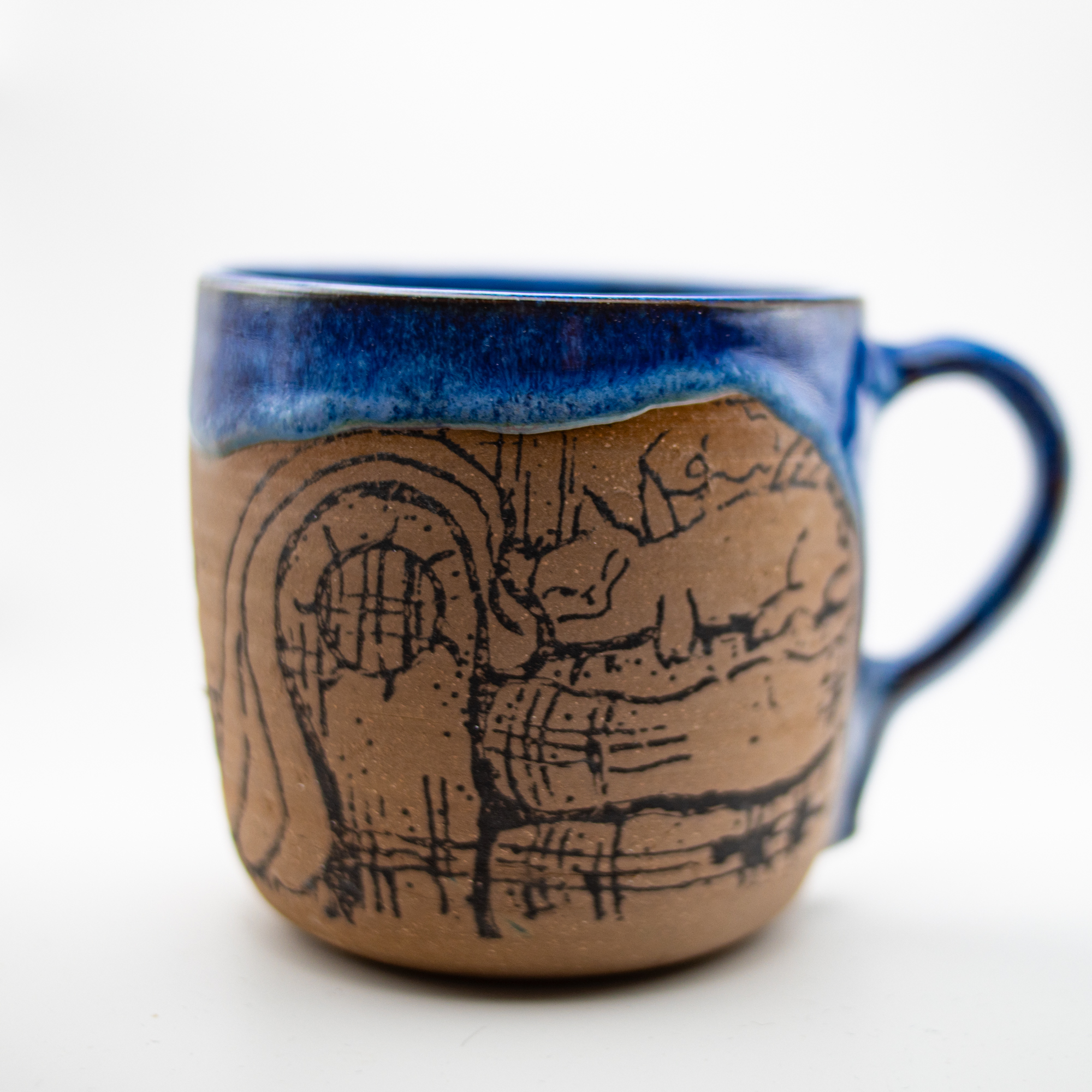 Handcrafted by Devine Vessels Pottery in their off-grid studio in Truxton, NY. , where small scale production, creativity and sustainability are paramount. This expertly crafted mug features a charming scene of a cozy cat nestled among books, all highlighted by a soothing blue glaze. Pride and prejudice book waiting for you to read curled up with your cat. Perfect for book lovers and cat enthusiasts alike, it offers a comforting touch to your daily coffee or tea ritual while adding a subtle quant flair to your kitchenware collection.