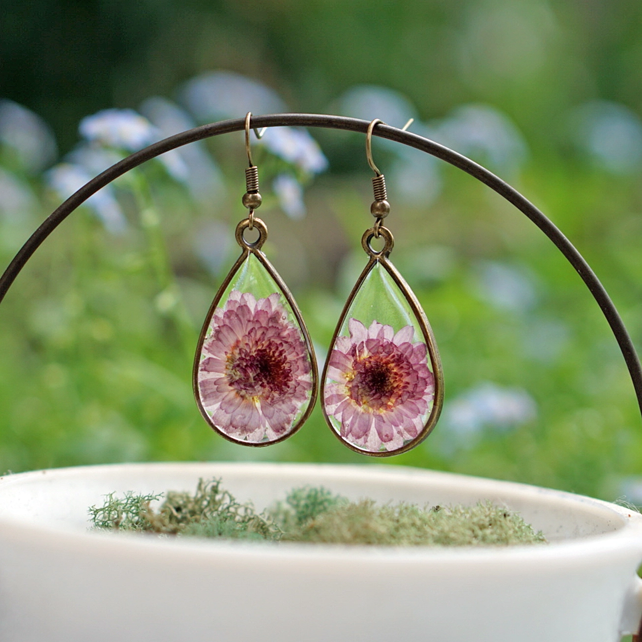 These beautiful earrings feature the September birth flower, Aster. The Pretty Pickle has used white Bellis Perennis with tinges of purple at the tips to represent the Aster and encased them in jewelry grade resin, within a teardrop aged bronze bezel.